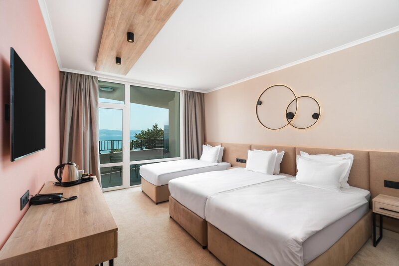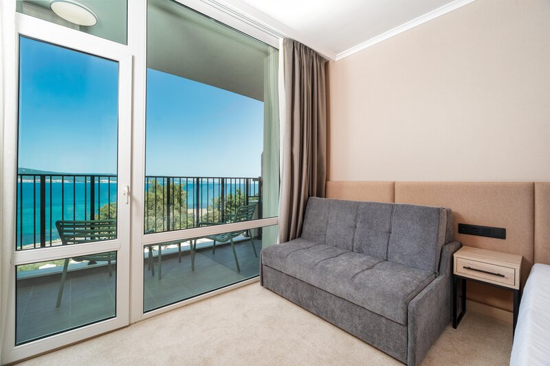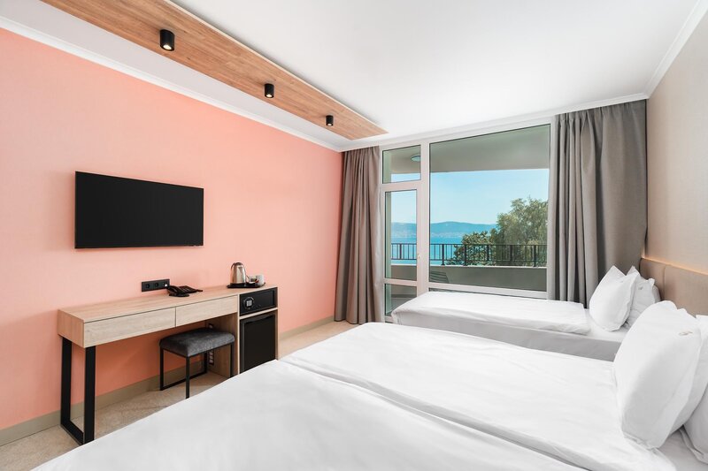 Poloha: Na južnom cípe Slnečného pobrežia. Rozľahlá, jemná piesočnatá pláž je vzdialená len 150 metrov. K dispozícii je autobusová doprava na Slnečné pobrežie. Romantické staré mesto Nesebar je vzdialené len kúsok pešo.