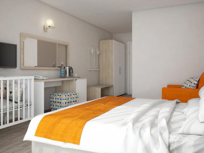 - Family room (FZX1), Familienzimmer, Nichtraucherzimmer, im Hauptgebäude, ca. 32 m², letzte Komplettrenovierung 2017, kombiniertes Wohn-/Schlafzimmer, 1 Doppelbett, 1 Schlafsofa (150x180cm), Klimaanlage: individuell regelbar, Fußboden: Laminat, Safe, Kühlschrank, Internet: WLAN/WiFi: ohne Gebühr, Fernseher: deutsches Programm, Sat-TV, Dusche, WC, Föhn, Balkon