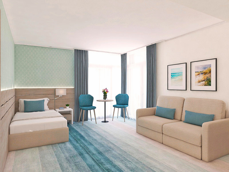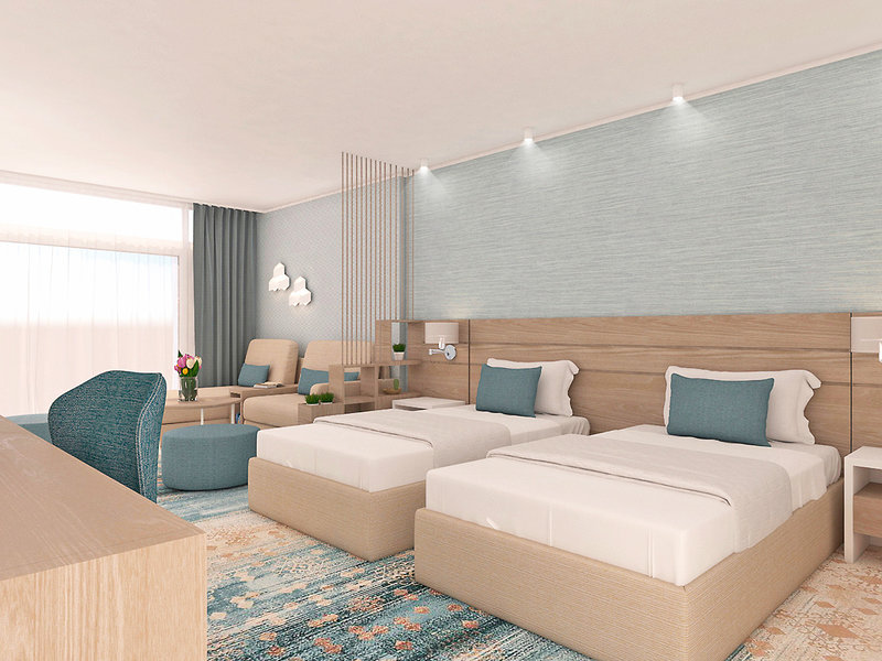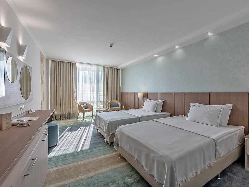 Ausstattung: Gepflegte Hotelanlage mit schöner Sonnenterrasse, Swimmingpool, Liegen und Badetücher am Pool, am Strand pro Zimmer 2 Liegen und 1 Schirm (01.06.-30.09., nach Verfügbarkeit), Poolbar. Empfangsbereich mit Rezeption, WLAN, Bar, Buffetrestaurant und À-la-carte-Restaurant. Landeskategorie: 4 Sterne, 330 Zimmer.