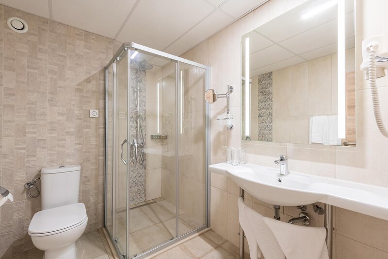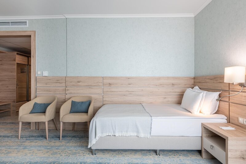 Obývanie: Dvojlôžková izba (dvojlôžková izba, cca 20 m2), klimatizácia, minibar, TV, telefón, trezor, WiFi. Sprcha, WC, fén. Balkón. Max. 2E+1K