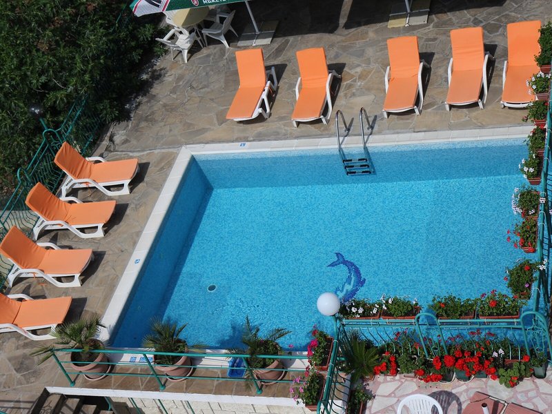 - Bazény: Vnútorný bazén, vonkajší bazén, slnečníky pri bazéne, ležadlá pri bazéne
