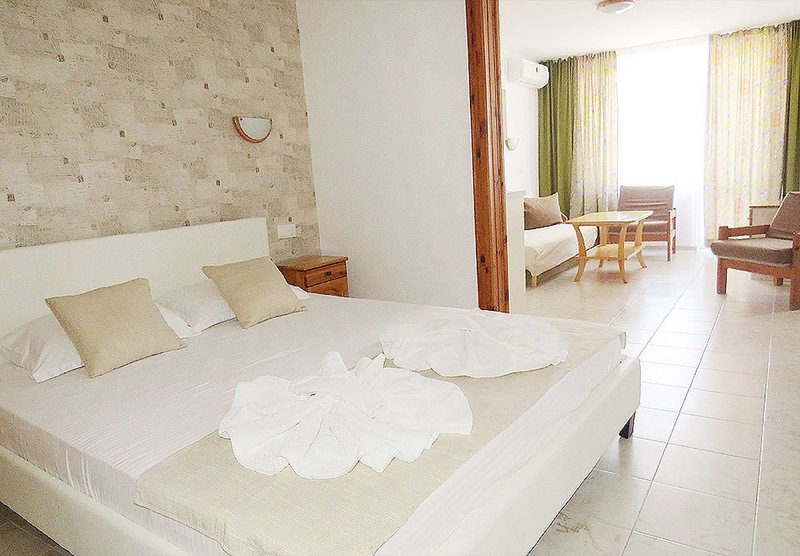 Studio mit/ohne Kitchenette: Die Studios ohne Kitchenette (S2A) verfügen über ein Doppelbett, 2 zusätzliche separate Betten, Dusche/WC, Kühlschrank, Föhn, Wasserkocher, Klimaanlage, Sat.-TV, Sitzecke mit Schlafcouch und einen möblierten Balkon zur Straßenseite.