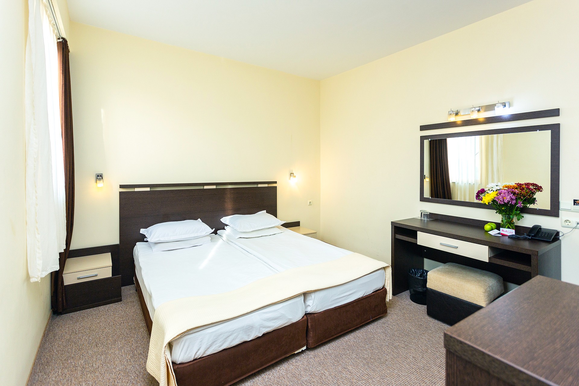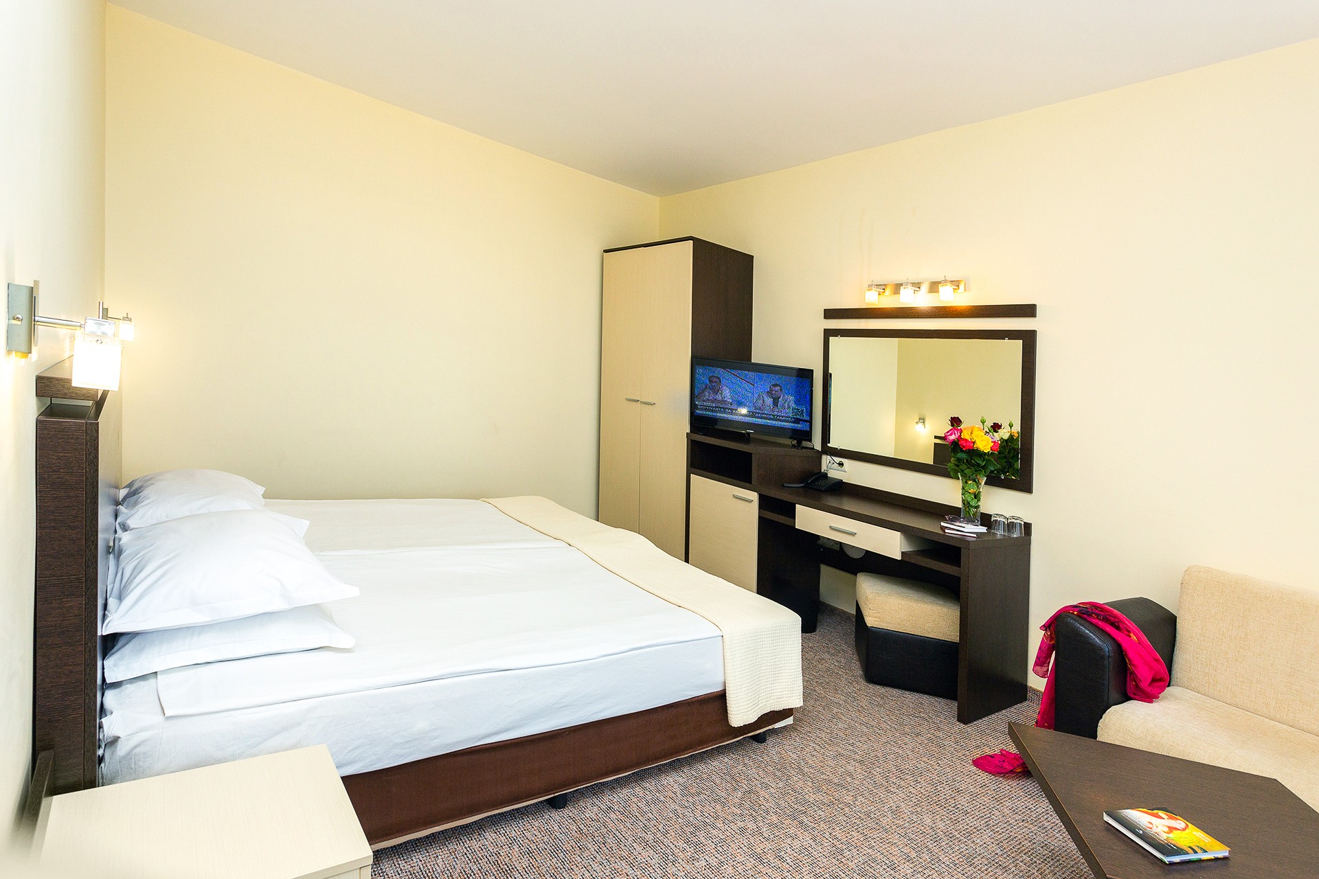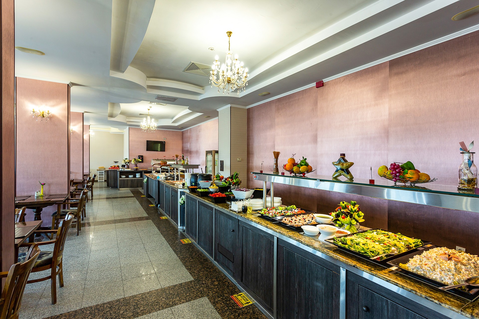 - Hlavná reštaurácia: 7.30–10.00 raňajky formou bufetu, 12.30–14.30 obed formou bufetu, 18.30–21.00 večera formou bufetu, na pitie nealkoholické nápoje, čaj, káva a vybrané alkoholické nápoje (miestnej výroby, niektoré importované, rozlievané), pivo, 1× týždenne tradičná bulharská alebo talianska večera