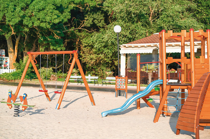 - Piesočnatá pláž: mierne svahovitá, verejná, verejné využívanie pláže zdarma, slnečníky, ležadlá, plážová osuška/osuška, kyvadlová doprava na pláž (cca 15.6.-15.9.)