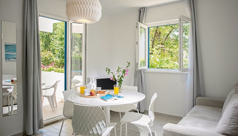 apartmánoch rozsiahleho rezortu na vás čaká čistý stredomorský životný štýl obklopený krásnou záhradou. Krásna kamienková pláž a rozmanité možnosti zábavy zaisťujú nadšenie.Vaše výhody: Priamo na pláži v pokojnej zátoke