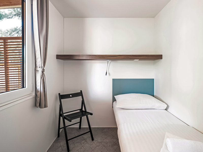[MH06] Superior Camping Mobile Home pre 4 dospelých + 2 deti, Terasa: min. 34 m², Kategória izby: Superior, Typ izby: Mobilný dom, Počet izieb: 2 spálne, 1 obývacia izba, 1 kúpeľňa, Počet postelí: 1 manželská posteľ, 1 poschodová posteľ, 1 rozkladacia pohovka, 1 jednolôžko, Detská postieľka k dispozícii ako prístelka: Áno, Všeobecné: Klimatizácia - zadarmo, Kúrenie, Terasa, Toaletný papier - zadarmo, Posteľná bielizeň - zadarmo, Uteráky - zadarmo, Kúpeľňa: WC, Sprcha, Obývacia časť: Sedenie, Rozkladacia pohovka, Kuchyňa: Kuchynský kút, Plynový/elektrický sporák, Kávovar, Chladnička, Mikrovlnná rúra, Kanvica, Základné kuchynské vybavenie, Médiá a technológie: TV
