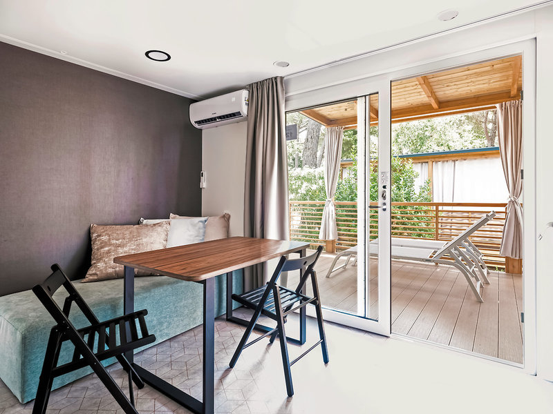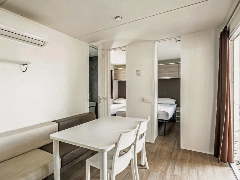 [MH06] Superior Camping Mobile Home 4 Erwachsene + 2 Kinder Terrasse: mind. 34 m², Zimmerkategorie: Superior, Zimmertyp: Mobile Home, Anzahl der Räume: Schlafraum 2x, Wohnraum 1x, Badezimmer 1x, Anzahl der Betten: Doppelbett 1x, Etagenbett 1x, Schlafsofa für 1 Person 1x, Twin Bett 1x, Gitterbett als Überbelegung möglich: Ja, Allgemein: Klimaanlage - gebührenfrei, Heizung, Terrasse, Toilettenpapier - gebührenfrei, Bettwäsche - gebührenfrei, Handtücher - gebührenfrei, Badezimmer: WC, Dusche, Wohnbereich: Sitzecke, Schlafsofa, Küche: Kochnische, Gas / E-Herd, Kaffeemaschine, Kühlschrank, Mikrowelle, Wasserkocher, Grundausstattung Küche, Medien & Technik: TV