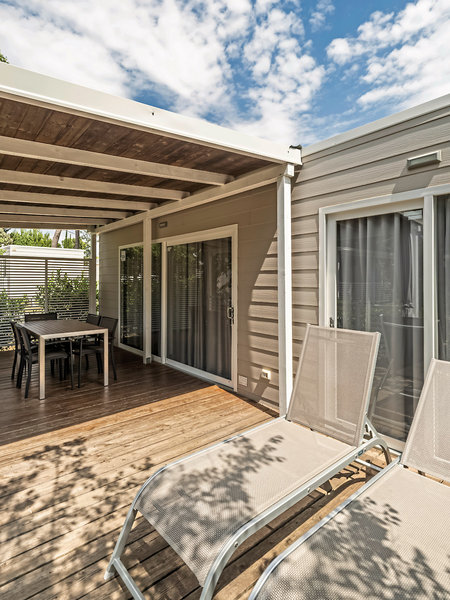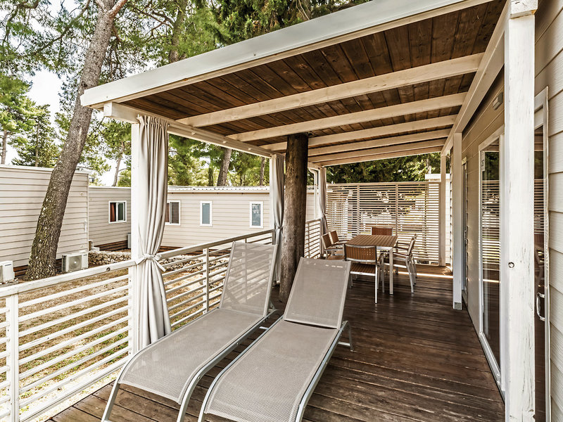Wohnen: [MH07] Deluxe Camping Mobile Home 4 Erwachsene + 1 Kind Terrasse: mind. 34 m², Zimmerkategorie: Deluxe, Zimmertyp: Mobile Home, Anzahl der Räume: Schlafraum 3x, Wohnraum 1x, Badezimmer 1x, Anzahl der Betten: Doppelbett 1x, Einzelbett 2x, Schlafsofa für 1 Person 1x, Gitterbett als Überbelegung möglich: Ja, Allgemein: Klimaanlage - gebührenfrei, Heizung - gebührenfrei, Terrasse, Wasserkocher, Kaffeemaschine, Toilettenpapier - gebührenfrei, Bettwäsche - gebührenfrei, Handtücher - gebührenfrei, Küchenwäsche - gebührenfrei, Badezimmer: Badewanne / Dusche, WC, Wohnbereich: Sitzecke, Schlafsofa, Küche: Kochnische, Gas / E-Herd, Geschirrspüler, Kaffeemaschine, Kühlschrank, Mikrowelle, Wasserkocher, Grundausstattung Küche, Medien & Technik: TV, WLAN/WIFI Internetanschluss - gebührenfrei