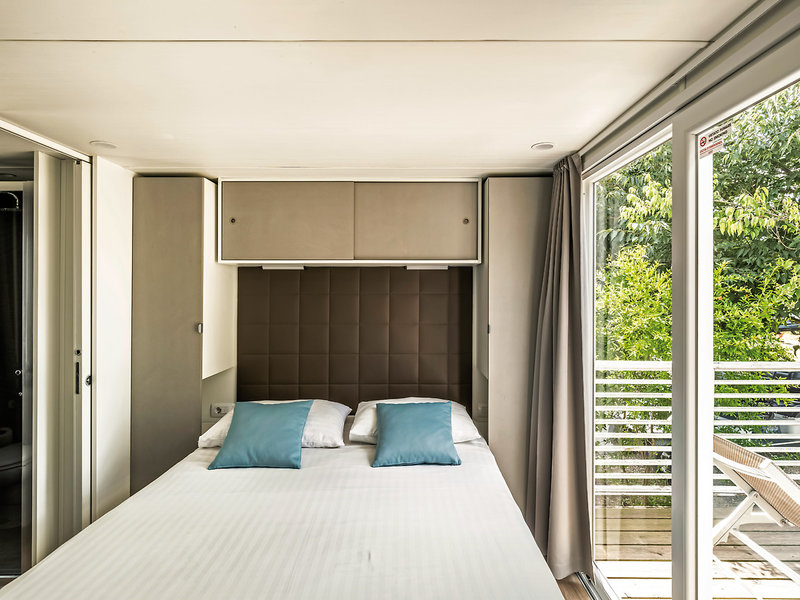 Ubytovanie: [MH07] Deluxe Camping Mobile Home 4 dospelí + 1 dieťa Terasa: min. 34 m², Kategória izby: Deluxe, Typ izby: Mobilný dom, Počet izieb: 3 spálne, 1 obývacia izba, 1 kúpeľňa, Počet postelí: 1 manželská posteľ, 2 jednolôžka, 1 rozkladacia pohovka, Detská postieľka k dispozícii ako prístelka: Áno, Všeobecné: Klimatizácia - zadarmo, Kúrenie - zadarmo, Terasa, Kanvica, Kávovar, Toaletný papier - zadarmo, Posteľná bielizeň - zadarmo, Uteráky - zadarmo, Kuchynské utierky - zadarmo, Kúpeľňa: Vaňa / Sprcha, WC, Obývacia časť: Sedenie, Rozkladacia pohovka, Kuchyňa: Kuchynský kút, Plynový / elektrický sporák, Umývačka riadu, Kávovar, Chladnička, Mikrovlnná rúra, Kanvica, Základné kuchynské vybavenie, Médiá a technológie: TV, Wi-Fi pripojenie na internet - zadarmo