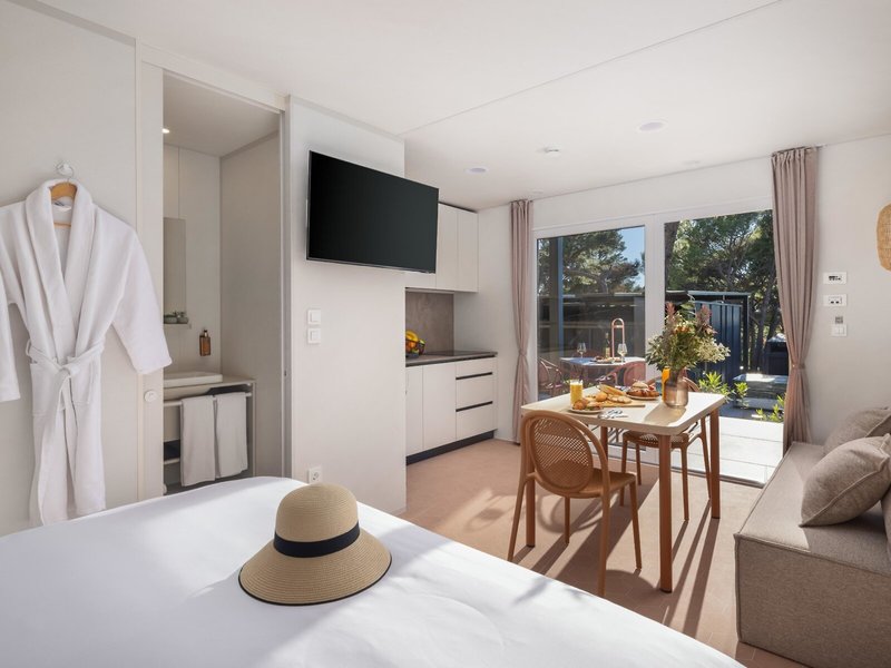- Glamping Escape so súkromnou vírivkou (MHX1), mobilný dom, cca 22 m², posledná kompletná rekonštrukcia 2025, celkový počet izieb v tomto type izby: 1, rozloženie: kombinovaná obývacia izba/spálňa, 1 manželská posteľ (160x200cm), 1 rozkladacia pohovka, detská postieľka: zadarmo, nutná žiadosť a rezervácia, moskytiéra, klimatizácia: zadarmo, apríl - október, individuálne ovládané, kúrenie: sezónne, individuálne ovládané, trezor: zadarmo, kuchynský kút, chladnička: zadarmo, plynový/elektrický sporák, umývačka riadu, kávovar/čajník, rýchlovarná kanvica, jedálenský stôl, internet: Wi-Fi: zadarmo, TV: plochá obrazovka, upratovacia služba: denne, zadarmo, sprcha, WC, župan: zadarmo, papuče: zadarmo, fén, terasa: s ležadlami, s posedením, s vírivkou
