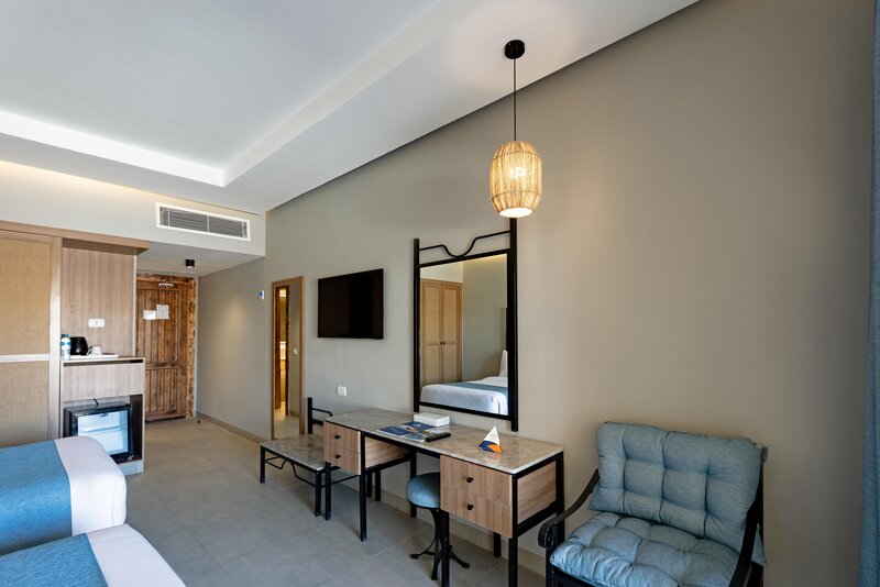 Ubytovanie: Izba Premium (s výhľadom na more): Minichladnička (za poplatok). TV, telefón, trezor (za poplatok). Vaňa alebo sprcha/WC, sušič vlasov. Balkón/terasa. Max. 3 dospelí.
