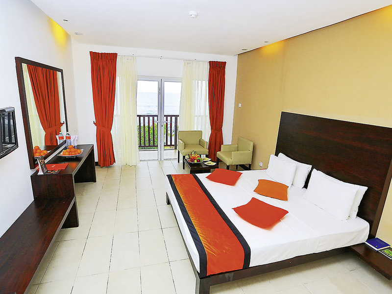 Deluxe-Zimmer (DZM, ca. 33 qm), Klimaanlage, Kühlschrank, Kaffee-/Teezubereiter, Telefon, TV, WLAN, Safe, Dusche, WC, Föhn, Balkon/Terrasse, Meerblick. Max. 3E