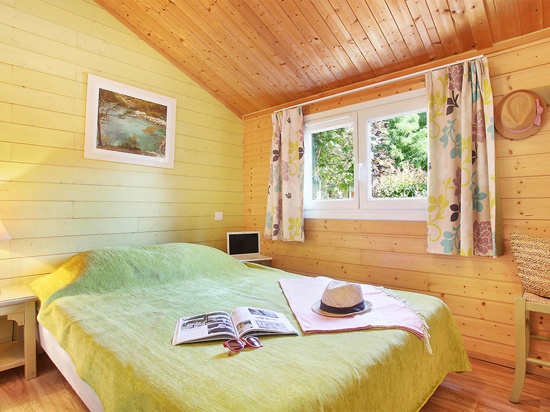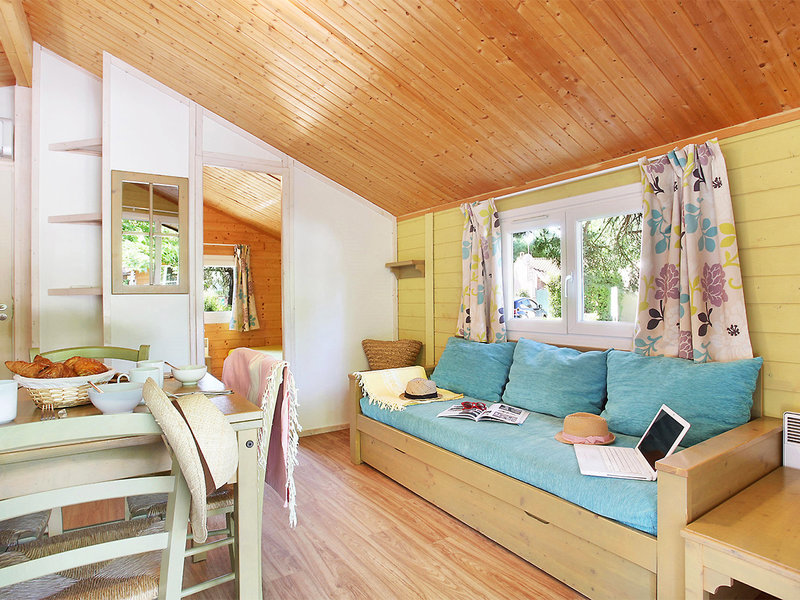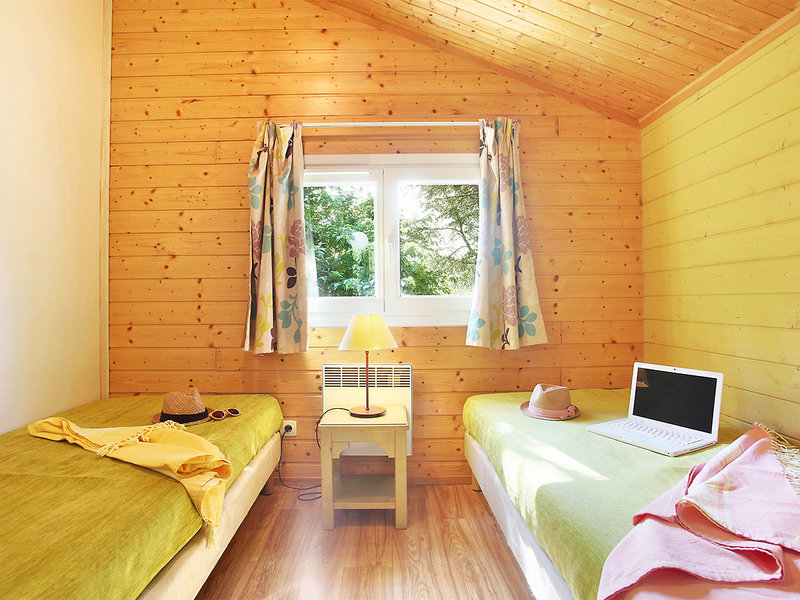 Wohnen: Chalets (CH6, ca. 18 qm), Klimaanlage, Wohn-/Schlafraum mit 2 Einzelbetten (90 x 190 cm), 2 Schlafzimmer (1x mit franz. Bett, 1x mit 2 Einzelbetten), TV, WLAN (inklusive), Kitchenette mit Mikrowelle und Spülmaschine. Dusche, WC. Überdachte Terrasse. Max. 6E, wahlweise zur Alleinnutzung (CH1) buchbar
