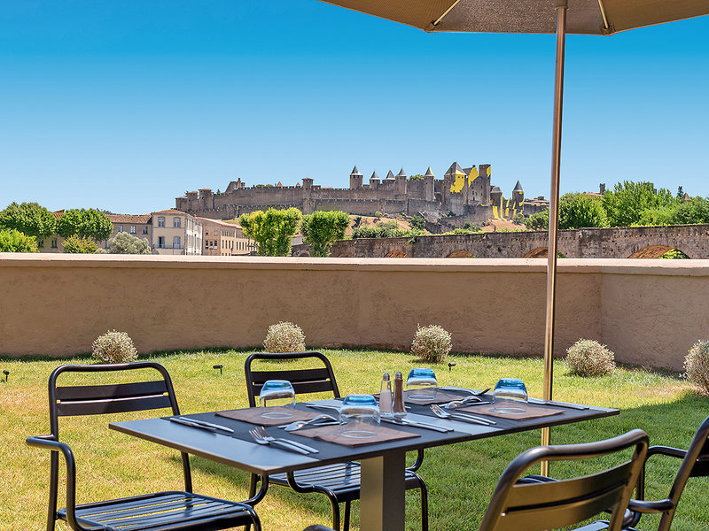 Ausstattung: Stilvolles Haus mit mittelalterlichem Dekor und atemberaubenden Blick auf die Stadtmauern. Empfangshalle mit Rezeption, WLAN (inklusive), Restaurant "Troubadour", Gästeterrasse. Städtische Tiefgarage in ca. 50 m Entfernung (ca. 7 Euro/Tag). Landeskategorie: 4 Sterne, 90 Zimmer, 3 Etagen, Lift.