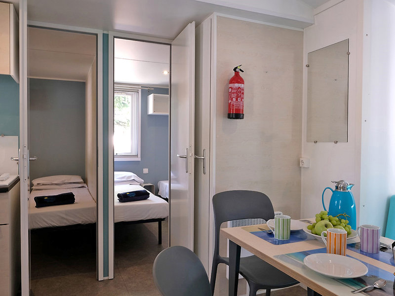 Bývanie: Mobilné domy Happy premium (MP6, cca 29 m2), obývacia izba, rozkladacia pohovka, 3 spálne (1x manželská posteľ, 2x 2 samostatné lôžka), klimatizácia (na vyžiadanie, cca 5 eur/deň), kuchynský kút. sprcha, WC. Polokrytá terasa, malý elektrický gril. Max. 6E