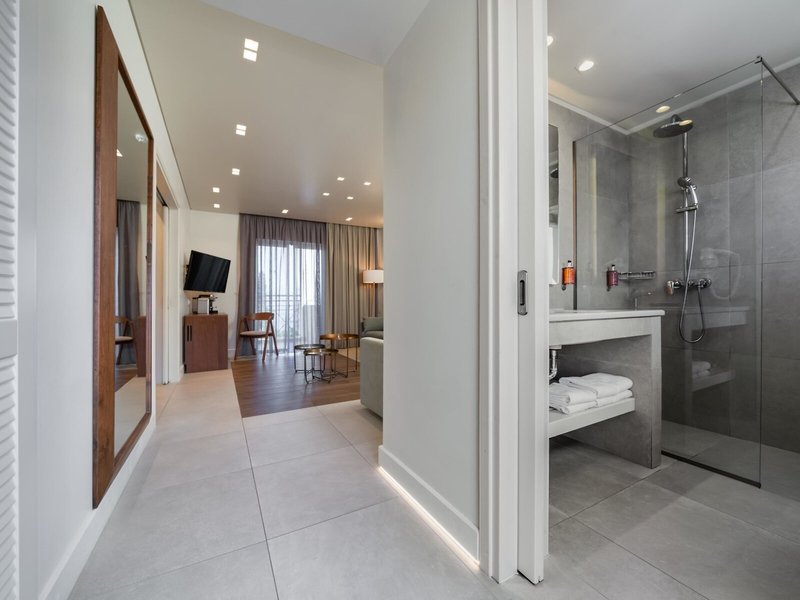- Suite (SUX1), Suite, eingeschränkter Meerblick, Gartenblick, ca. 52 m², letzte Komplettrenovierung 2018, Gesamtanzahl der Räume in diesem Zimmertyp: 1, Aufteilung wie folgt: kombiniertes Wohn-/Schlafzimmer, bestehend aus 2 Zimmern, optisch getrennt durch Schiebetür, 1 Schlafzimmer, 1 Doppelbett, 3 Schlafsofas, Klimaanlage: ohne Gebühr, bei All Inclusive inklusive, individuell regelbar, kalt, warm, Heizung: individuell regelbar, Fußboden: Fliesenboden, Safe: ohne Gebühr, bei All Inclusive inklusive, Sofa, Schreibtisch, Kühlschrank, Espressomaschine, Kaffee-/Teezubereiter, Wasserkocher, Telefon, Internet: WLAN/WiFi: ohne Gebühr, bei All Inclusive inklusive, Fernseher: Sat-TV, Dusche, WC, Bademantel: ohne Gebühr, bei All Inclusive inklusive, Slipper: ohne Gebühr, bei All Inclusive inklusive, Föhn, Balkon oder Terrasse: mit Sitzgelegenheit