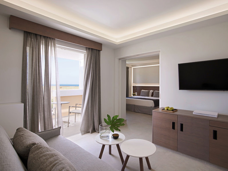 - 51-60 qm, Suite, Deluxe, Nebengebäude, Meerblick (zum Teil seitlich), renoviert, 1 separates Schlafzimmer, 1 separater Wohnraum, Doppelbett (Kingsize), Sofabett, 1 Bad, Regendusche, WC, Bademantel, Badeslipper, Haartrockner, Kosmetikspiegel, Klimaanlage, individuell regulierbar, Minibar, Auffüllung bei Anreise, Safe, 2 TVs (Sat-TV, Flachbildschirm), WLAN, Kaffeemaschine, Kaffee/Tee, Kühlschrank, Balkon oder Terrasse (möbliert), hochwertige Badartikel
