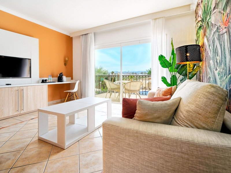 - Junior Suite, Pool View (JSX1), Juniorsuite, Mindestalter im Zimmer: 16 Jahre, im Hauptgebäude, Poolblick, ca. 45 m², letzte Komplettrenovierung 2015, letzte Teilrenovierung 2015, Gesamtanzahl der Räume in diesem Zimmertyp: 2, Aufteilung wie folgt: Wohnzimmer, 1 Schlafzimmer, 2 Einzelbetten (100x200cm), 1 Schlafsofa (135x180cm), Babybett: ohne Gebühr, Anfrage & Reservierung notwendig, Klimaanlage: Januar - Dezember, individuell regelbar, kalt, Fußboden: Fliesenboden, Safe: Barzahlung, pro Tag ca. 3 EUR, Sofa, Schreibtisch, Kühlschrank: ohne Gebühr, Mikrowelle, Kaffee-/Teezubereiter, Telefon, Internet: WLAN/WiFi: ohne Gebühr, Fernseher: Flatscreen, im Wohnbereich, im Schlafzimmer, Badewanne oder Dusche, WC, Föhn, Kosmetikspiegel, Balkon oder Terrasse: mit Sitzgelegenheit