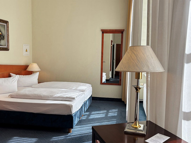 Einzelzimmer (EZ, ca. 12 qm), Heizung, TV, WLAN (inklusive), Safe, kleiner Kühlschrank. Bad/Dusche, WC, Föhn