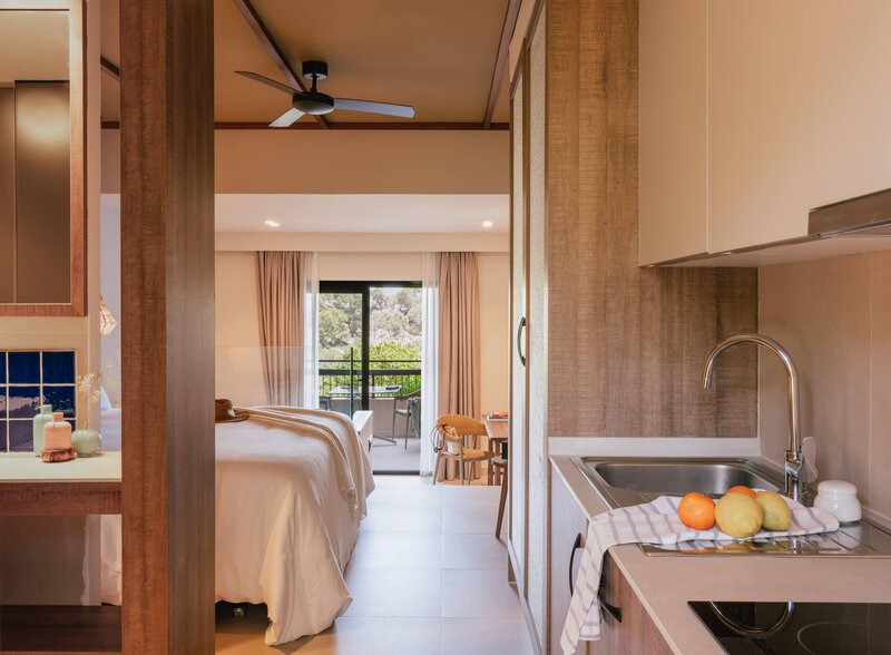 Wohnen: Juniorsuite (JS, ca. 36 qm), Klimaanlage, Kühlschrank, TV, WLAN, Safe. Bad mit Dusche, Föhn. Balkon/Terrasse mit Gartenblick. Max. 3E+1K/2E+2K, auch zur Alleinnutzung buchbar (JSE)