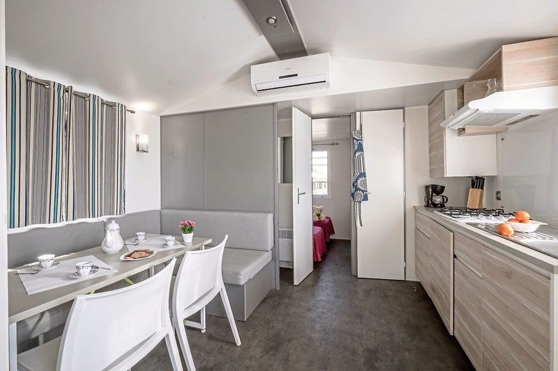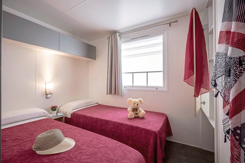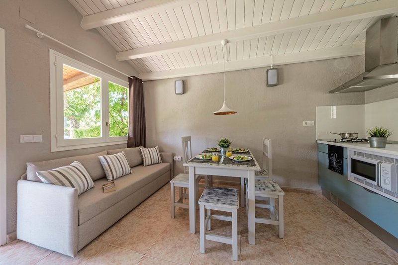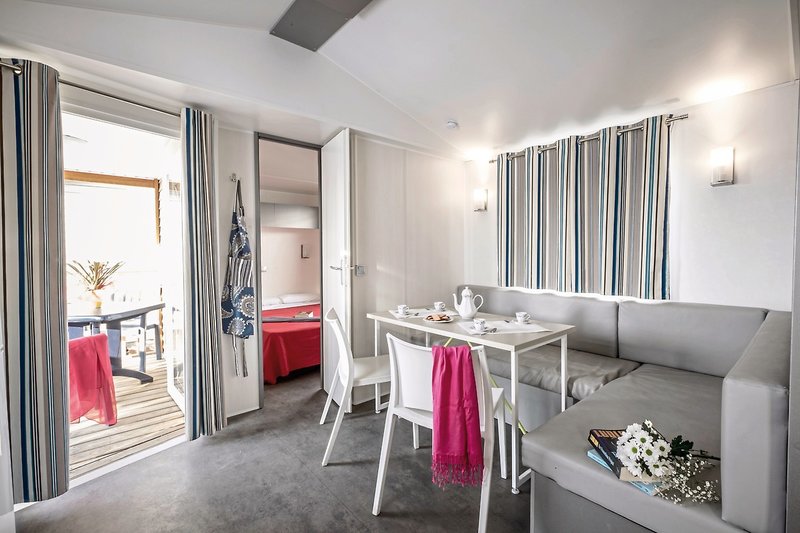 - 31-35 m², mobilný domček, 2 samostatné spálne, obývacia izba/spálňa, 2 jednolôžka, manželská posteľ, rozkladacia pohovka, sprchovací kút, WC, klimatizácia, TV s plochou obrazovkou, kuchynský kút, plynový/elektrický sporák, mikrovlnná rúra, kávovar, chladnička, terasa (zariadená), posteľná bielizeň poskytovaná zdarma, výmena posteľnej bielizne raz týždenne, uteráky poskytované zadarmo, výmena uterákov dvakrát týždenne, kuchynské utierky je potrebné priniesť so sebou, náklady na energie (bezplatne), záverečné upratovanie zabezpečuje nájomca alebo sa platí na mieste (cca 35 EUR/pobyt), (cca 35 CHF/pobyt), záloha (kreditná karta, cca 150 EUR/pobyt), (cca 150 CHF/pobyt)
