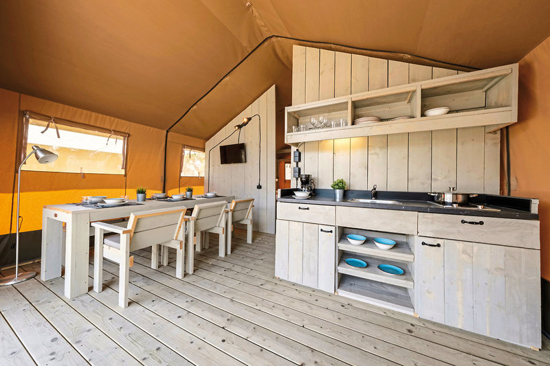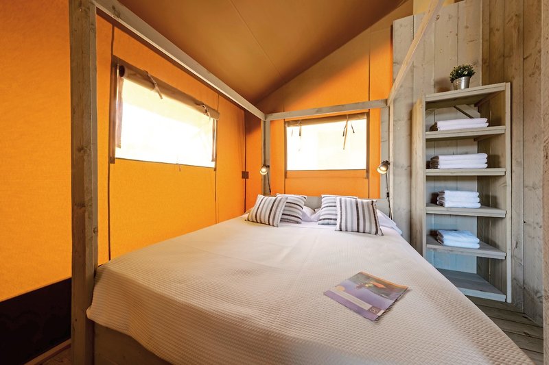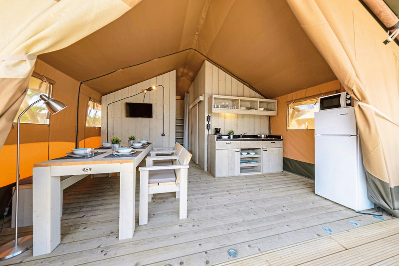 - 31-35 m², stan, 2 samostatné spálne, obývacia izba spojená s jedálňou, 1 jednolôžko, 1 manželská posteľ, 1 poschodová posteľ, sprcha, WC, klimatizácia, TV s plochou obrazovkou, kuchynský kút, plynový/elektrický sporák (2 horáky), mikrovlnná rúra, kávovar, chladnička, terasa, posteľná bielizeň poskytovaná zdarma, výmena posteľnej bielizne raz týždenne, uteráky poskytované zadarmo, výmena uterákov dvakrát týždenne, kuchynské utierky je potrebné priniesť so sebou, náklady na energie (bezplatne), záverečné upratovanie si hosť zabezpečí sám alebo sa platí na mieste (cca 35 EUR/pobyt) (cca 35 CHF/pobyt), záloha (kreditná karta, cca 150 EUR/pobyt) (cca 150 CHF/pobyt). (Vzhľadom na charakter safari stanov s plátennými stenami nie je tesnenie vzduchotesné. Preto teplota klimatizácie nemusí byť vždy požadovaná)