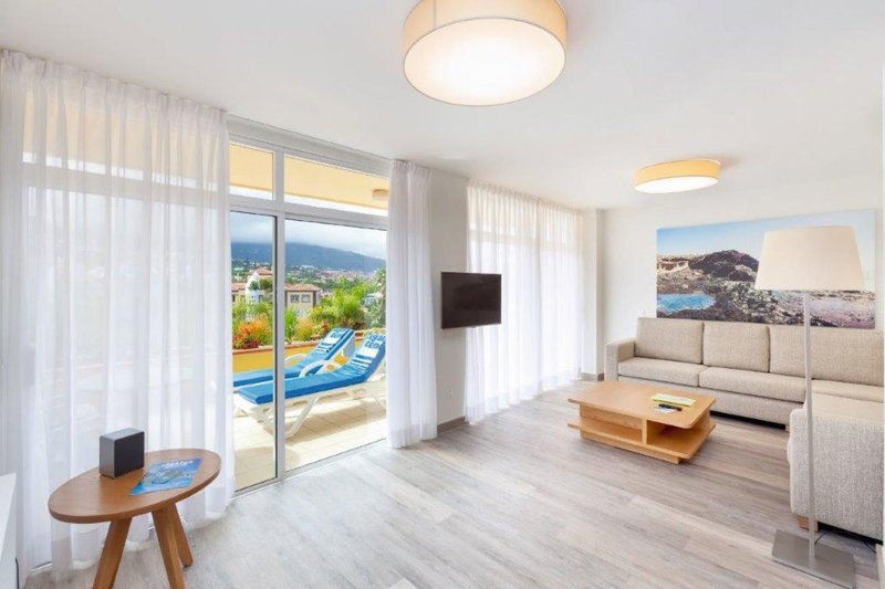 Apartment Superior seitl. Meerblick (ca. 70 m²): Alle Apartments sind Richtung Westen gelegen. Wohnraum mit Essbereich mit Kitchenette, TV mit dt. Programmen, Telefon, separatem Schlafzimmer, Badewanne und separater Dusche, WC, Föhn. In der 2. bis 5. Etage gelegen und verfügen über eine große möblierte Terrasse mit komfortabler Ausstattung. Herrlicher Ausblick über das Orotava-Tal, den Teide und bis zum Atlantik (2AQ).
