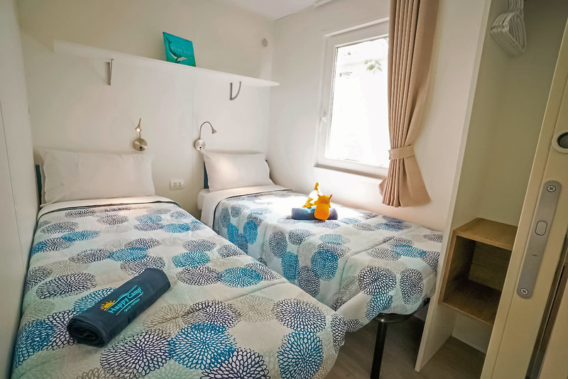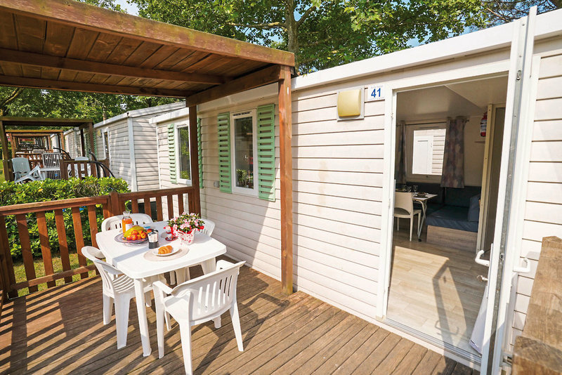 - 26-30 m², mobilný domček, nefajčiarsky, 3 samostatné spálne, obývacia izba/spacia časť, 4 samostatné postele, manželská posteľ, sprcha, WC, klimatizácia (za poplatok), kuchynský kút, jedálenský kút (lavica pre ďalšiu možnosť spania), veranda (zariadená, čiastočne krytá), 1 parkovacie miesto na jednotku, gril, posteľná bielizeň si možno prenajať na mieste (cca 20 EUR/balenie, nutná rezervácia vopred), uteráky si možno prenajať na mieste (cca 10 EUR/balenie, nutná rezervácia vopred), kuchynské utierky si treba priniesť so sebou, náklady na energie (bezplatne), záverečné upratovanie si hosť môže zabezpečiť sám alebo sa platí na mieste (cca 50 EUR/pobyt), kaucia (v hotovosti, cca 100 EUR/pobyt)