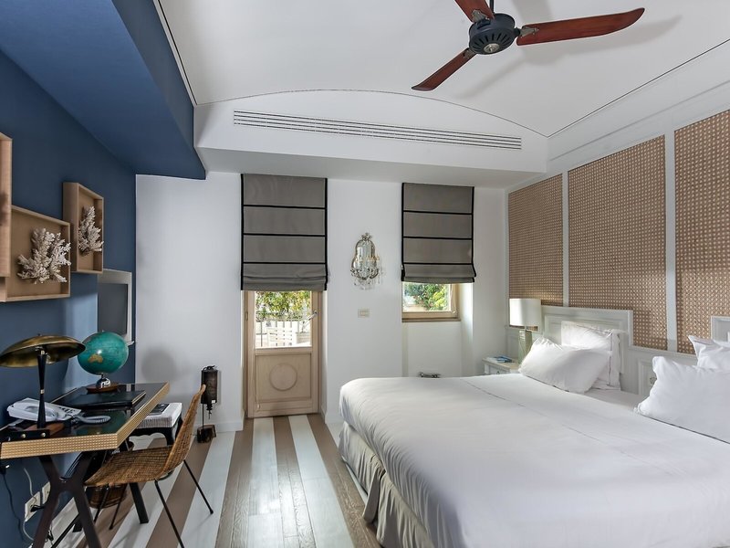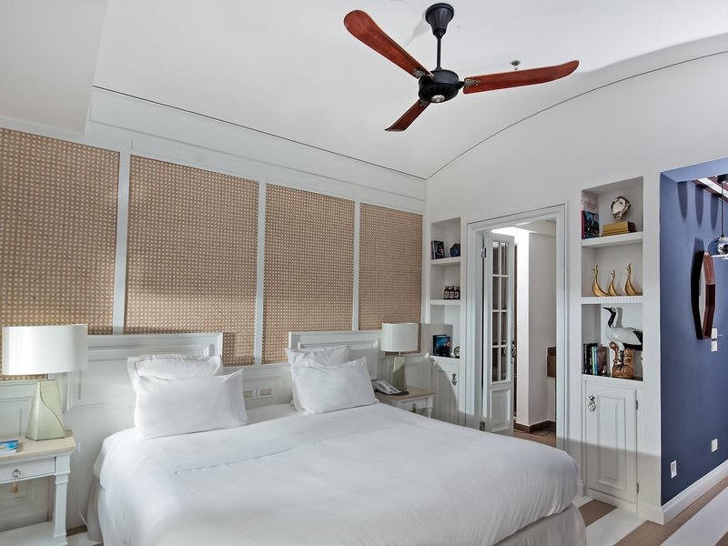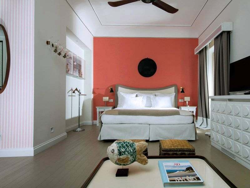 - Deluxe room (DZM1), Doppelzimmer, im Hauptgebäude, Meerseite, Meerblick, ca. 35 - 40 m², letzte Komplettrenovierung 2016, letzte Teilrenovierung 2019, Gesamtanzahl der Räume in diesem Zimmertyp: 4, Aufteilung wie folgt: 1 Schlafzimmer, 1 King Size Bett (180x200cm), Babybett, Klimaanlage: individuell regelbar, kalt, warm, Heizung: individuell regelbar, Fußboden: Parkett, Safe, Deckenventilator, Schreibtisch, Minibar: Softdrinks, Wasser, alkoholische Getränke, Snacks, Minibarauffüllung, Telefon, Internet: WLAN/WiFi, Breitband-Internet/DSL, Fernseher: Flatscreen, im Schlafzimmer, deutsches Programm, Sat-TV, SKY-Programme, Roomservice, Reinigungsservice, Badewanne oder Dusche, Dusche, WC, Bademantel, Slipper, Föhn, Balkon: mit Sitzgelegenheit