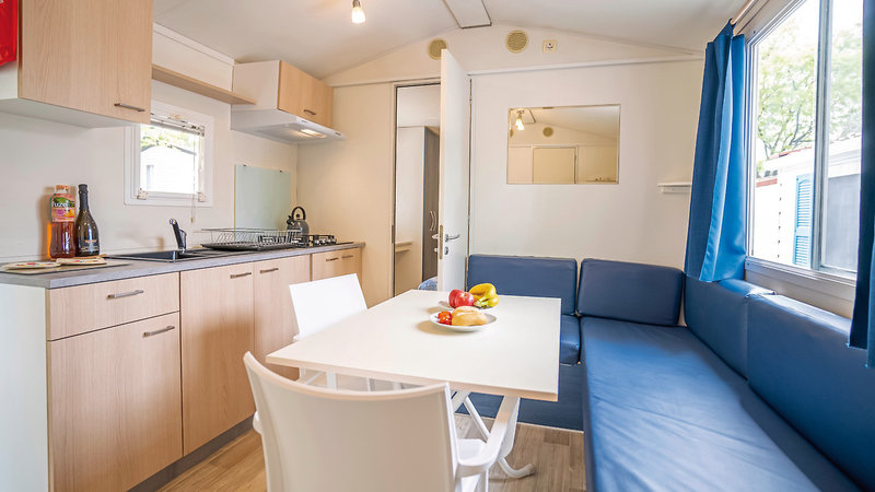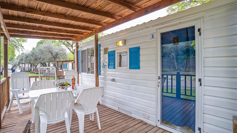 - 21-25 m², mobilný domček, 2 samostatné spálne, kombinovaná obývacia/spacia časť, 2 jednolôžka, rozkladacia posteľ (vhodná pre 1 osobu max. 150 cm a 60 kg), manželská posteľ, sprcha, WC, klimatizácia (za poplatok), kuchynský kút, jedálenský kút (lavica na ďalšie spanie), zariadená terasa (alebo altánok), 1 parkovacie miesto na jednotku, gril, posteľná bielizeň si možno prenajať na mieste (cca 20 EUR/balenie, nutná rezervácia vopred), uteráky si možno prenajať na mieste (cca 10 EUR/balenie, nutná rezervácia vopred), kuchynské utierky si treba priniesť so sebou, náklady na energie (bezplatne), záverečné upratovanie (vykoná hosť sám alebo sa platí na mieste, cca 40 EUR/pobyt), kaucia (v hotovosti, cca 100 EUR/pobyt), kaucia (cca 100 CHF/pobyt)