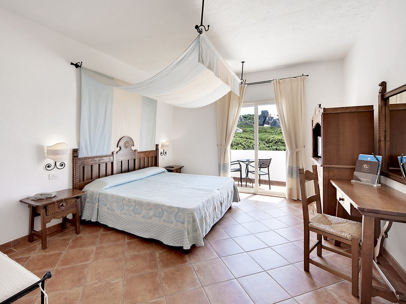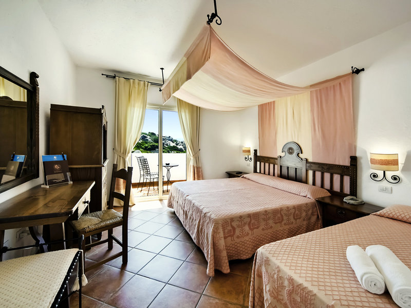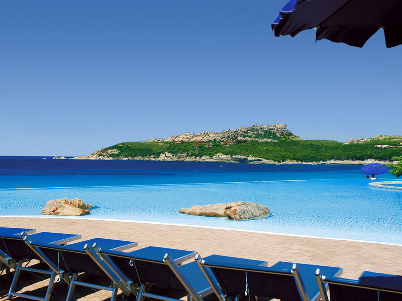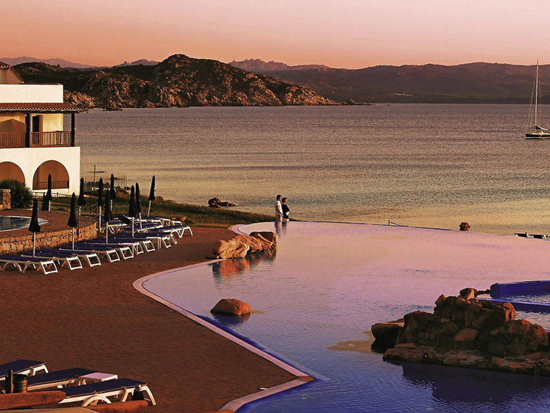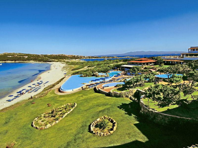 Lage & Umgebung Das Hotel liegt in leichter Hanglage mit einem traumhaften Panoramablick über die Nordwestküste, das Capo Testa und bis nach Korsika. Der Hotelstrand ist unmittelbar über Stufen erreichbar. Santa Teresa Gallura ist etwa 4 km und Olbia ca. 70 km entfernt. Aufgrund der Lage des Hotels ist ein Mietwagen empfehlenswert.