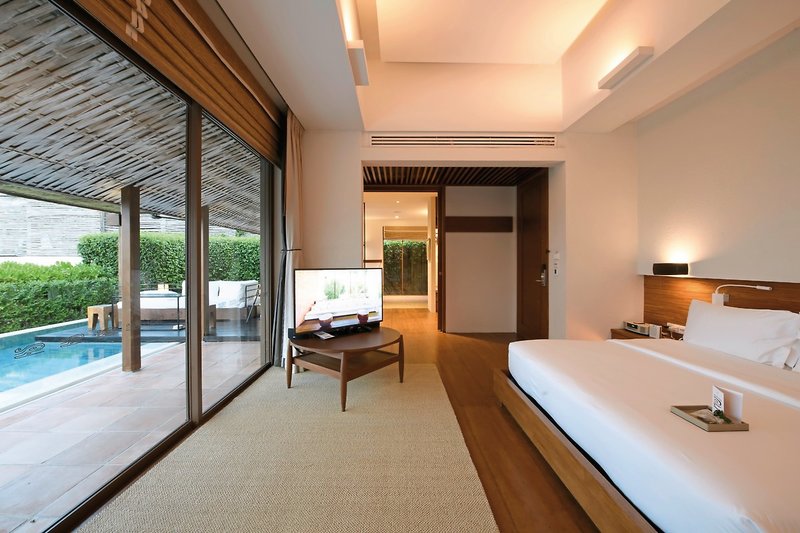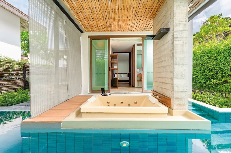 - 121-150 qm, Villa, Lage im Resortteil „Beachside“, Erdgeschoss, Gartenblick, Nichtraucher, Ankleidebereich, Daybed, Doppelbett (Kingsize), Whirlwanne, Regendusche, mit Dampffunktion, bodengleich, Außendusche, WC, Bademantel, Haartrockner, Kosmetikspiegel, Klimaanlage, Minibar, Auffüllung täglich, Softdrinks, Wasser, Safe, Bügelbrett, Bügeleisen, TV (Sat-TV, Flachbildschirm), On-Demand-Kanal (Musik- und Filmauswahl), Musikanlage, Bluetooth-Lautsprecher, WLAN, Wasserkocher, Espressomaschine, Kaffee/Tee, Terrasse (möbliert, teilweise überdacht), Terrasse, schwimmend (möbliert, überdacht), Privatpool 41-45 qm, Butlerservice, hochwertige Badartikel, Aufdeck-Service, Anzahl Zimmer: 2