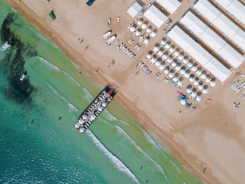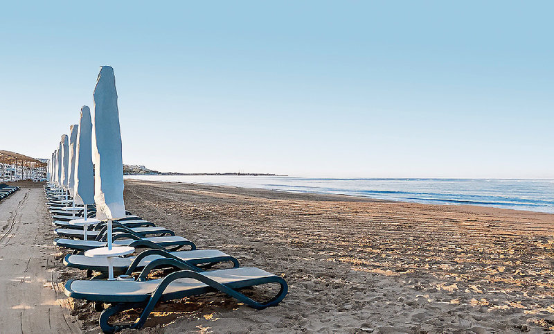 - Piesočnatá pláž: mierne svahovita, oddelená od rezortu cestou, k dispozícii je podchod/most, slnečníky, ležadlá, plážový uterák/osuška, cca 01.04.-15.11.